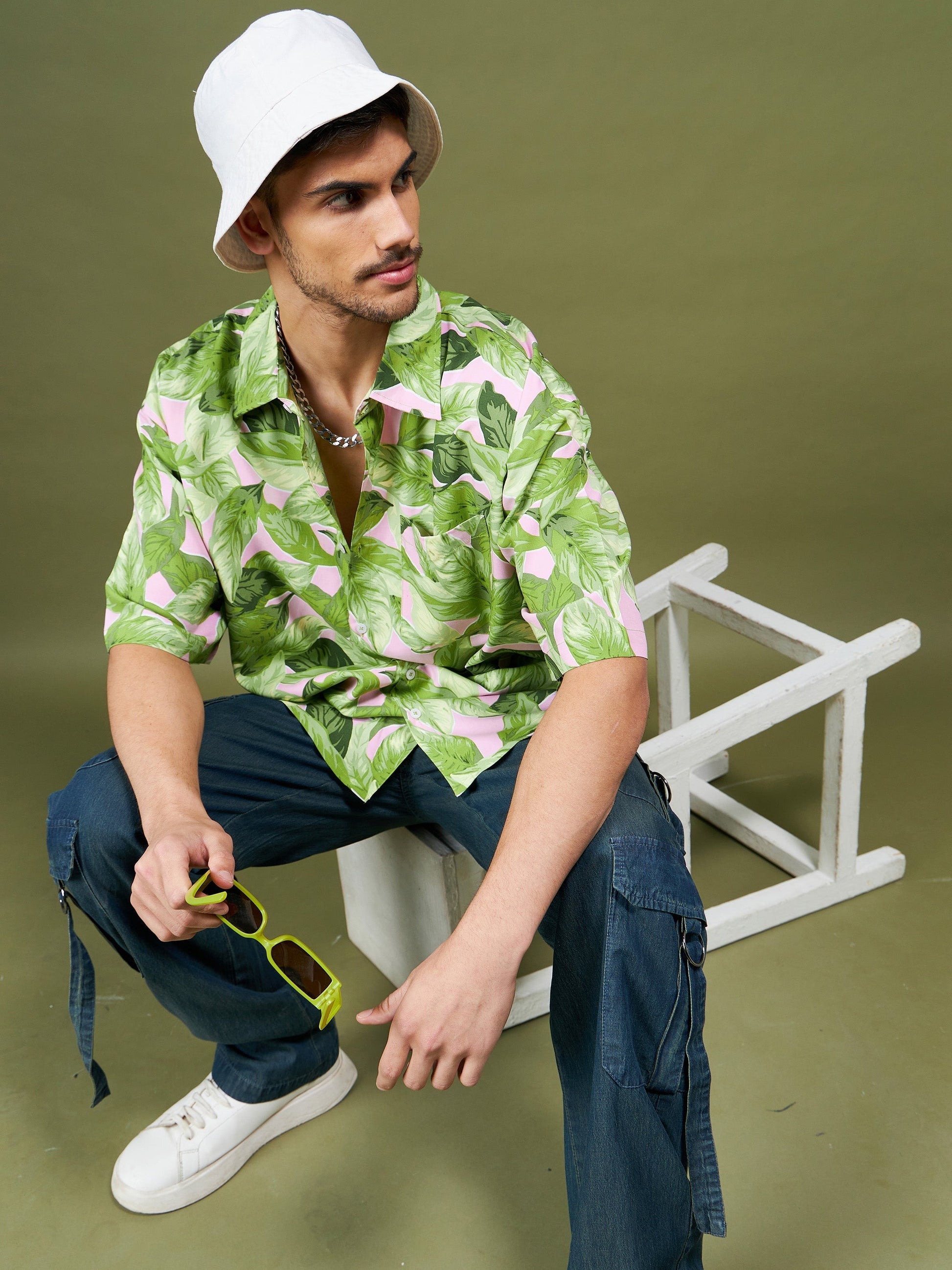 Men Green Tropical Oversized Shirt, in Rayon fabric, Unlined, Regular length, Oversize Fit, Button Closure, Straight Hemline and features Oversized Fit