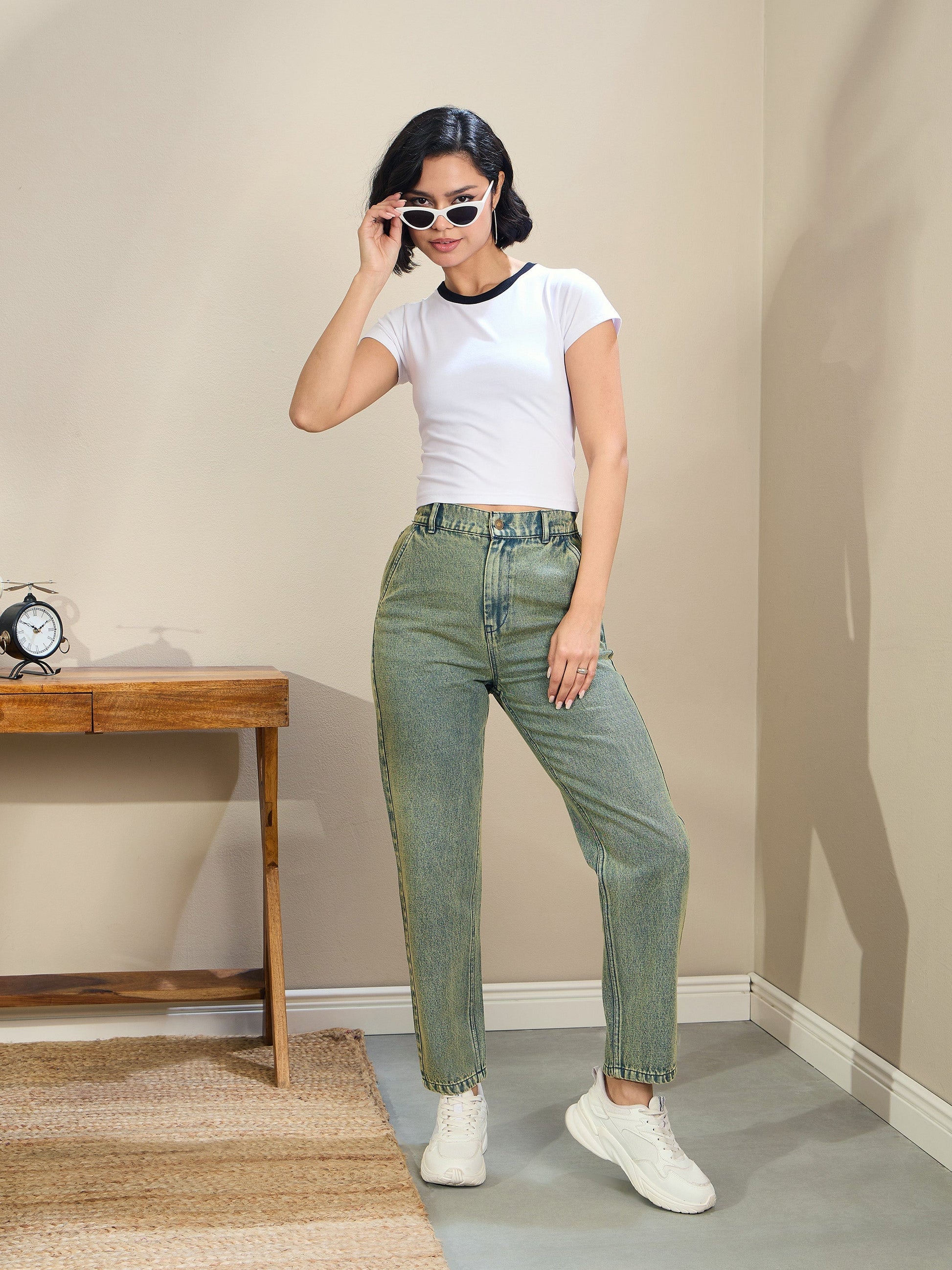 Green Washed Tapered Jeans, in Denim fabric, Unlined, Full Length, Comfort Fit, Button Closure, Taper Hemline and features Pocket Detail