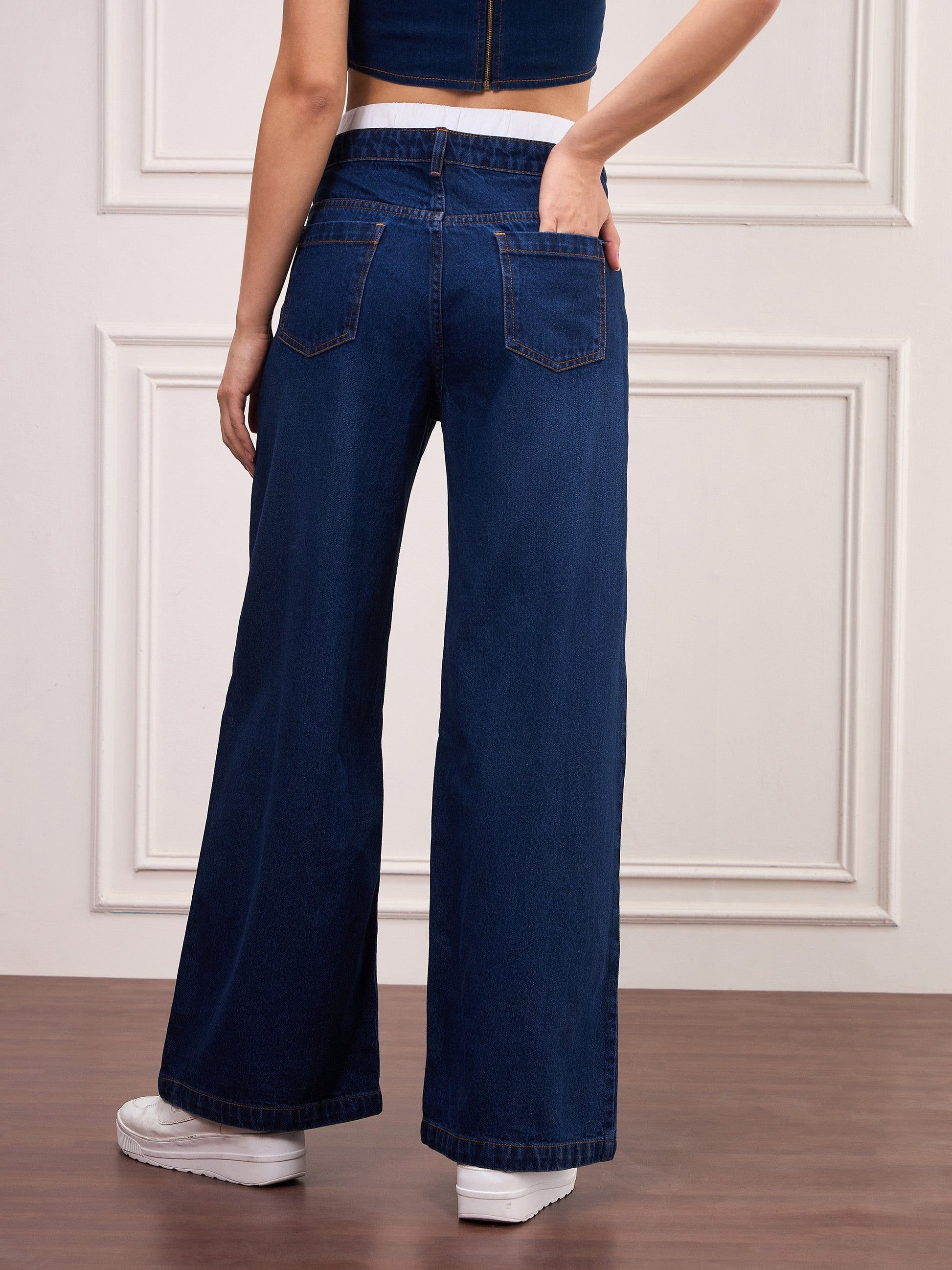Women Navy Blue Double Waistband Jeans